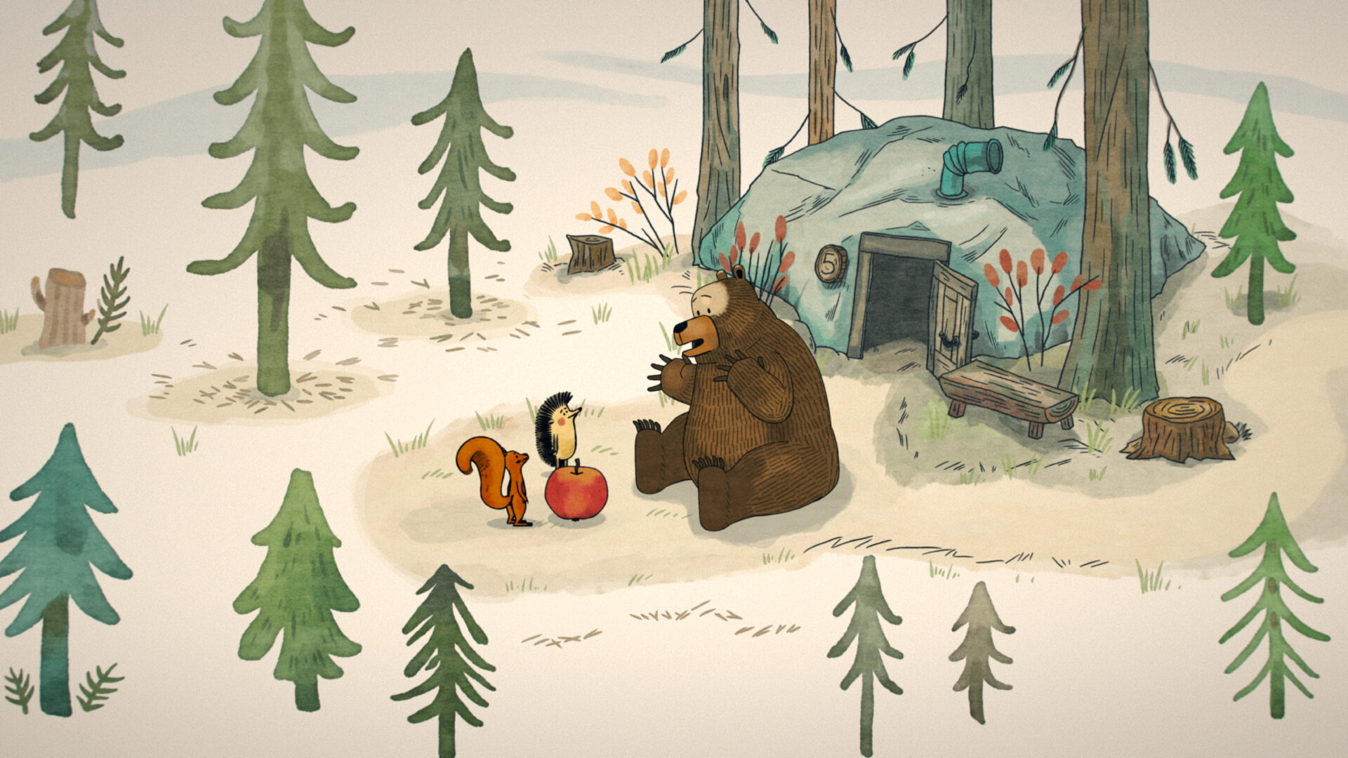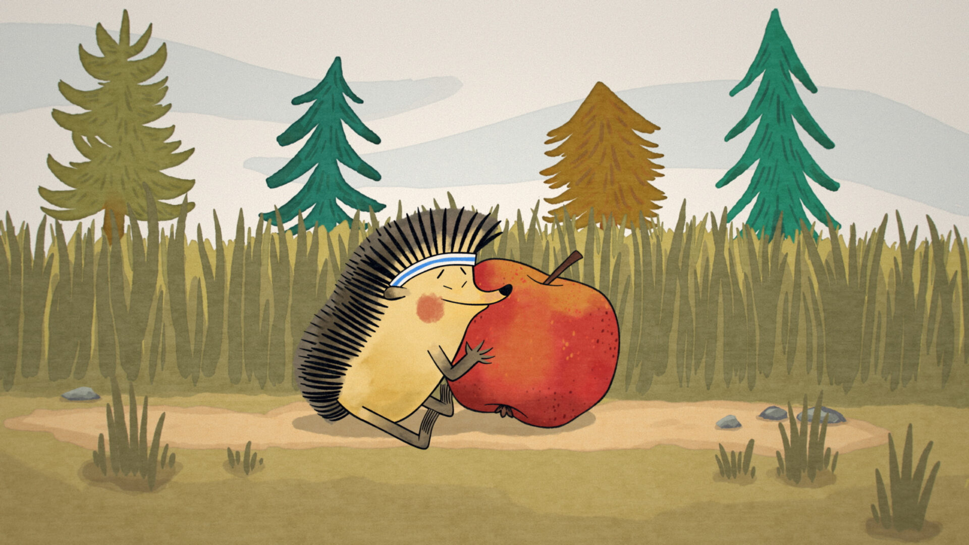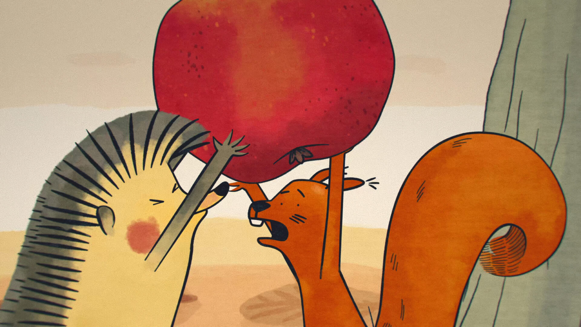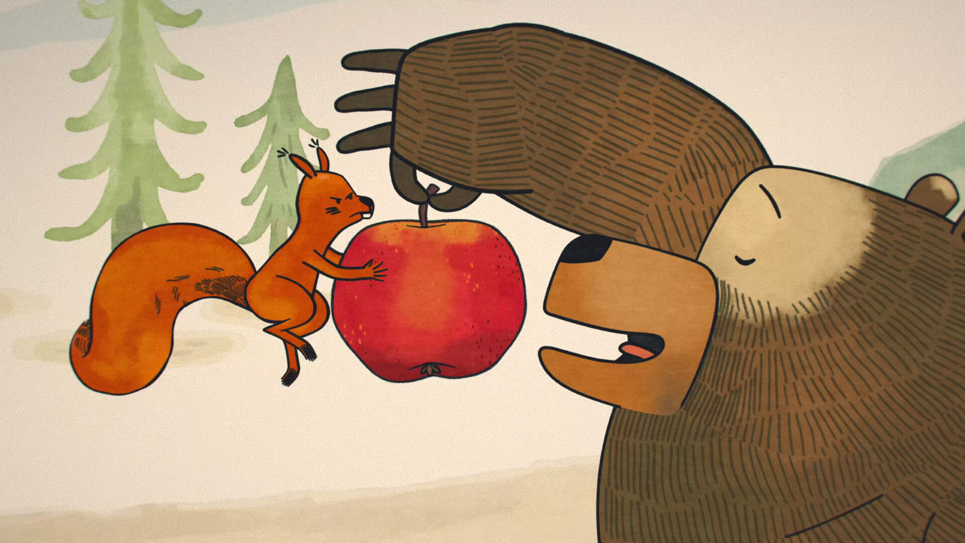 During a morning walk, a hedgehog comes across a beautiful red apple. He takes it to the front of his dwelling and begins rearranging the interior of his home. Meanwhile, a squirrel stumbles upon the beautiful apple. A quarrel breaks out between the two friends over who the fruit really belongs to. They ask the other forest inhabitants for their opinions as well. Disappointed by the rabbit’s indecisiveness and the bear’s greed, the arguing pair set off to seek advice from the wise owl. She soon discovers that it is an apple of discord, in which a trace of evil has taken root, and she eventually succeeds in driving the malice out. Not much of the apple remains, but the hedgehog and the squirrel are overjoyed that their friendship has withstood a demanding test.